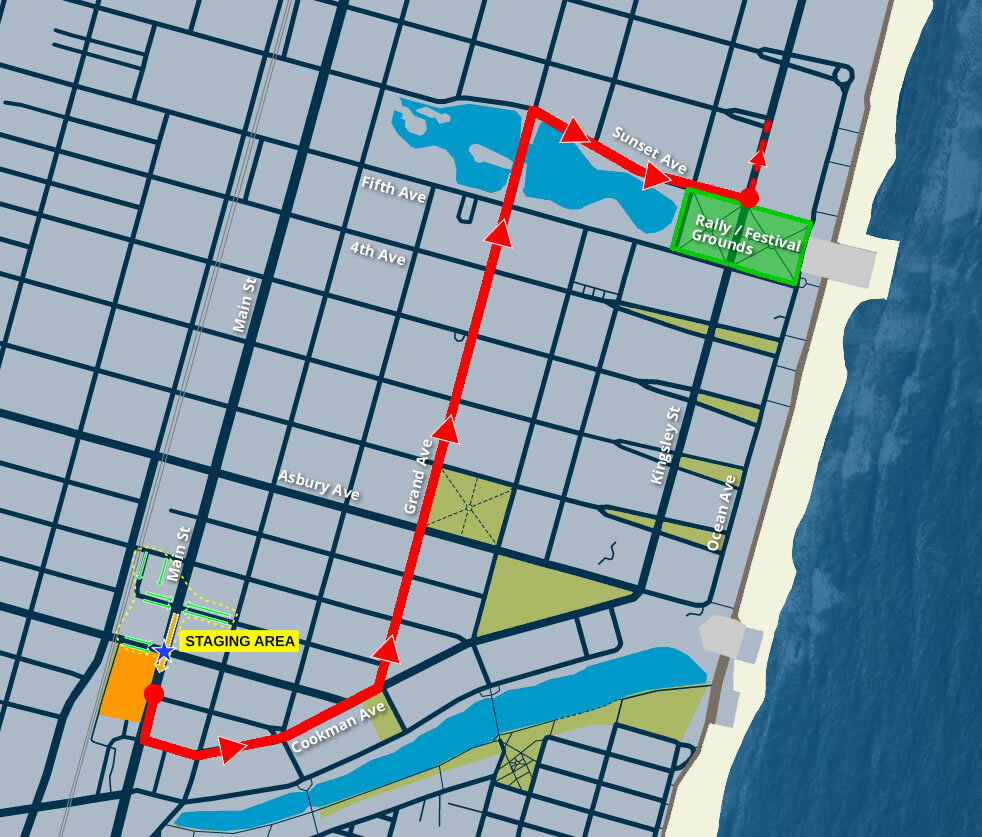If you’d like to enjoy the free parade festivities, the procession begins at Asbury Park City Hall and travels south along Main Street. It then turns left onto Cookman Avenue toward the ocean, followed by a left onto Grand Avenue. From there, the parade heads north on Grand until it reaches Sunset Avenue, where it makes a right and concludes at the Rally and Festival Grounds.