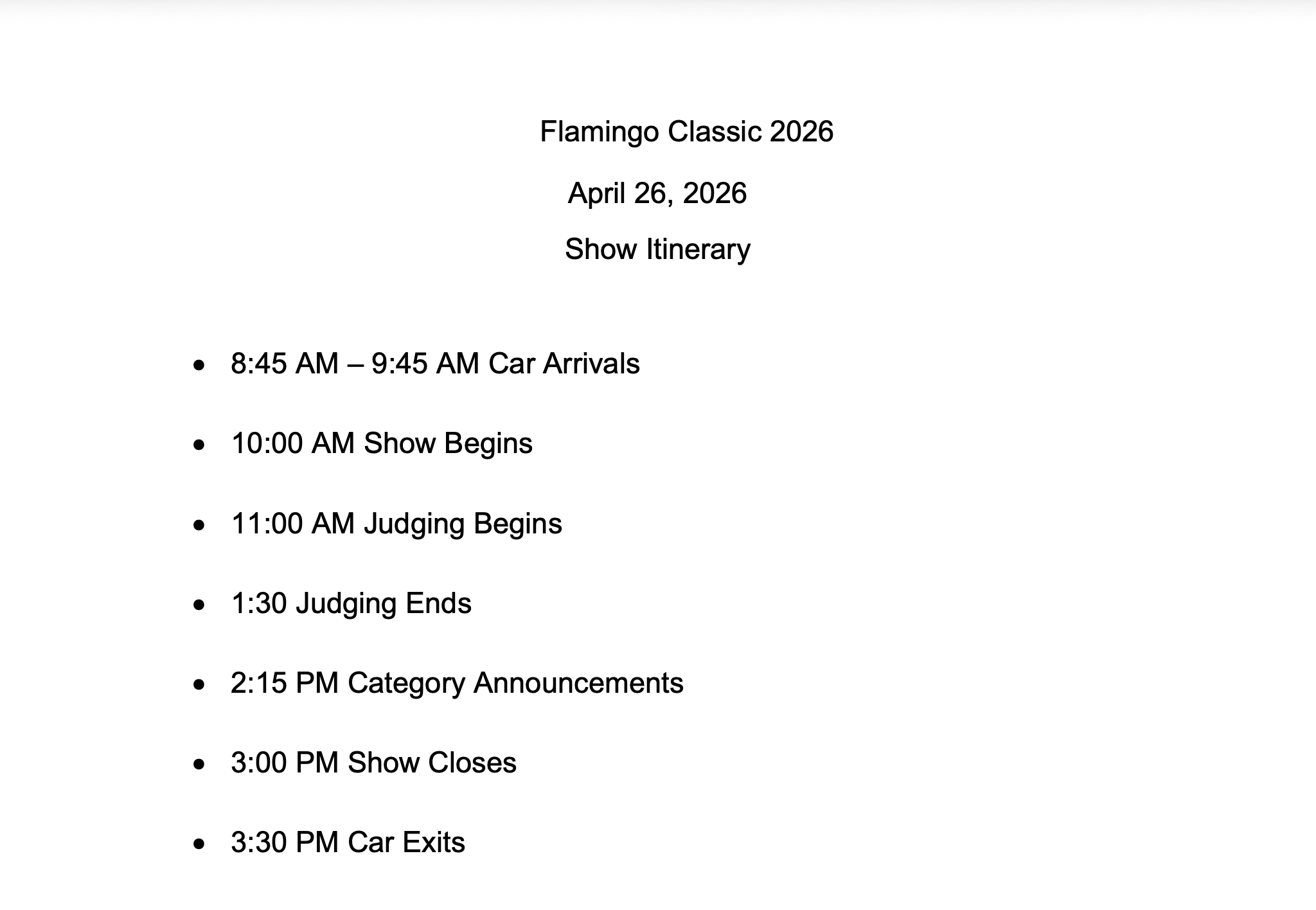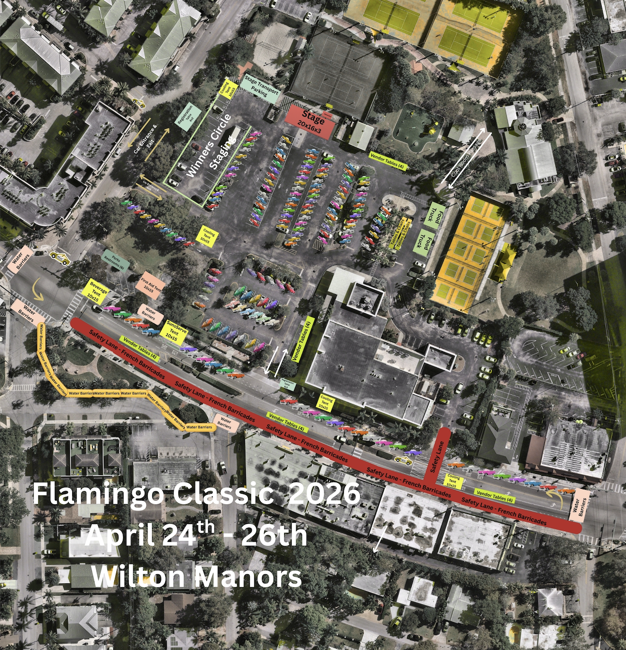 Join us for the inaugural Flamingo Classic in Wilton Manors! This registration is exclusively for the show. We will be closing Wilton Drive from 20th Street to 21st Street just for this event. A site map is posted below the flyer with the show schedule. Expect a fantastic day filled with activities and exceptional judges for the show. Be sure to check the Flyer below for the Show Schedule. We know some of you may hesitate to bring your car out in the rain, but rest assured, this is a rain or shine event! April is actually the driest month in South Florida, so you have nothing to worry about. Your ticket covers: Car Registration. All entry details with map will be emailed to you after you register.